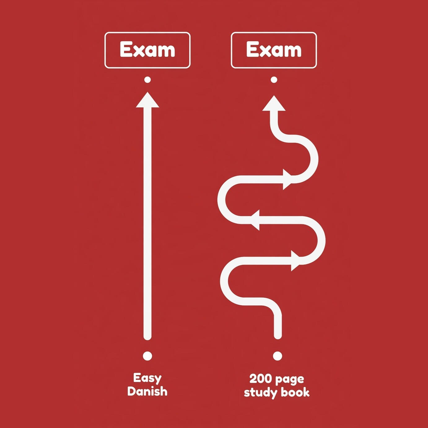 Knowing what to study is the key to success without stress. Through deep knowledge of the Danish exams, a system has been made that focuses specifically on the things that will determine your grade held up against the time they take to learn so you get maximum return on invested time.